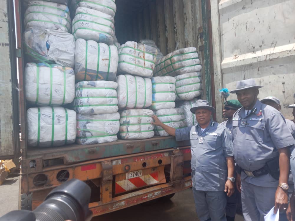 The bales of used clothes in a 2x40ft containers carrying 518 bales and 392 jumbo bales of same used clothes concealed in heavy duty trucks and buses were intercepted along Benin-Okada axis and Umueikaa/Aba Road.